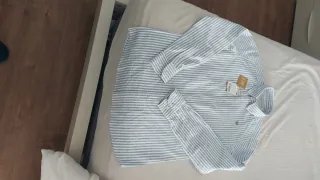 Pack de dos camisetas de la marca Springfield en talla S. Para ser talla S, no son muy pequeñas. Mido 1.79 y peso 77 kg y me quedan más o menos bien, algo justas (suelo usar talla M). Están en buen estado, muy pocos usos. Una camiseta es azul con rayas claras y la otra es de color coral con un estampado de árbol azul.