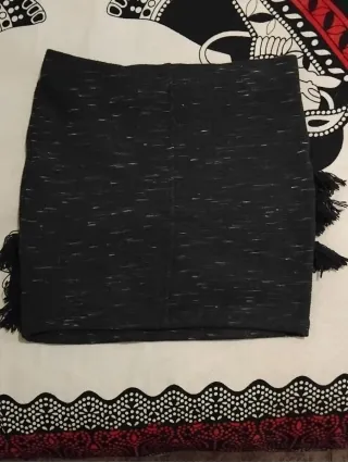 Falda corta de tejido con un diseño moderno y llamativo. La parte inferior está adornada con capas de flecos que le dan movimiento. - Tejido con textura jaspeada. - Detalle de flecos en cascada.