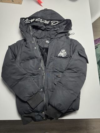 Cazadora acolchada con capucha y detalles de la marca KWD. - Cierre de cremallera. - Bolsillos frontales con cremallera. - Puños y bajo elásticos. Practicamente nueva por quedarse pequeña