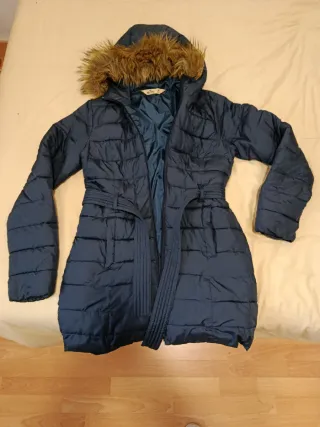 Abrigo de mujer marca Hollister, Talla M: - Diseño acolchado, como de plumas. - Capucha con pelo extraible - Cinturón para ajustar la cintura. - En muy buen estado.