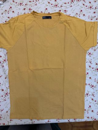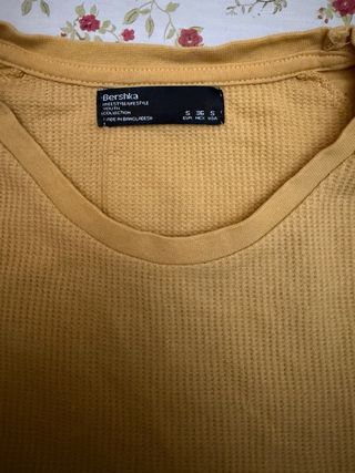 Camiseta de manga corta de la marca Bershka en color amarillo. Presenta un tejido texturizado. Oversize. - Cuello redondo. - Mangas raglán.