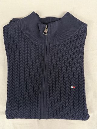 Nueva, sin etiqueta. Ha permanecido guardada. Con punto en espiga, es elástica, cómoda y ligera. Azul marino, con logotipo discreto de la marca. Corte recto. Ancho 50cm, 67cm largo de la cremallera. Talla S
