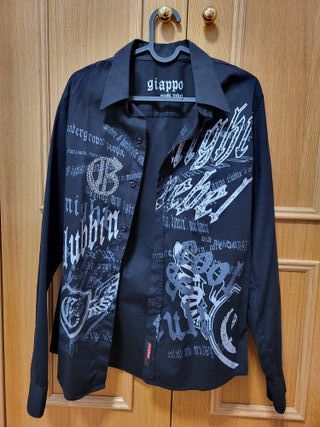 Camisa estampada. Night rebel. Giappo Club. Manga larga. Estilo ochentero, rock (...). Elegante Marca: Giappo Color: Negra, gris, con brillantes, plateado. Talla: M Corte: Entallada Envío 24H