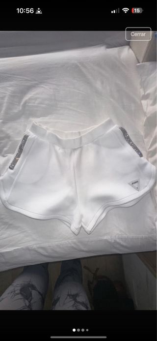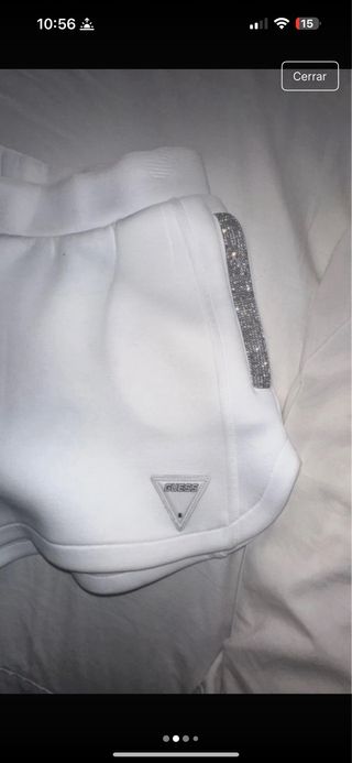 Pantalón corto de la marca Guess en color blanco. Presenta detalles brillantes en los bolsillos y un pequeño logo triangular en la parte inferior. - Diseño deportivo. - Ribete en los bajos.