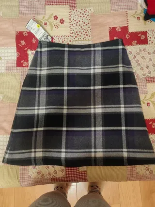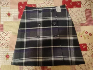 Falda de cuadros estilo colegiala de la marca Yessica. - Diseño de cuadros en tonos grises, blancos y morados. Botones de adorno. - Cierre lateral de cremallera