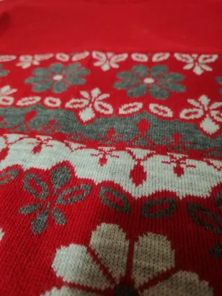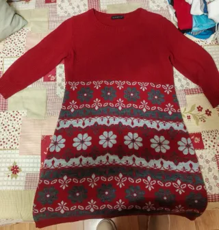 Vestido de lana con un bonito estampado invernal. - Diseño de punto con cuello redondo. - Mangas largas. - Estampado de flores y grecas en contraste. - Largo hasta las rodillas