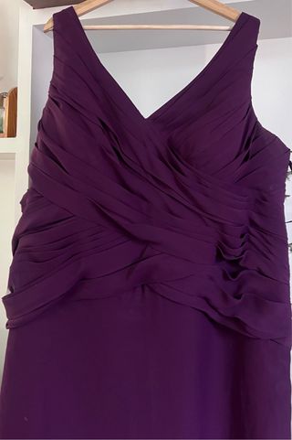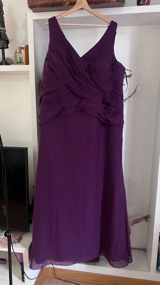 Elegante vestido largo, ideal para madrinas o eventos especiales. - Diseño con escote en V. - Cuerpo drapeado y fruncido. - Falda fluida y con caída -Tiene ballenas en el delantero y espalda para ajustar perfectamente en pecho y cuerpo . -Tiene cazuelas interiores en el pecho Usado solo 1 vez y enviado a la tintorería para limpiar Medidas : Pecho 60 Cintura 61 Cadera 68 Largo desde el hombro 161 El color exterior es color vino/ morado oscuro