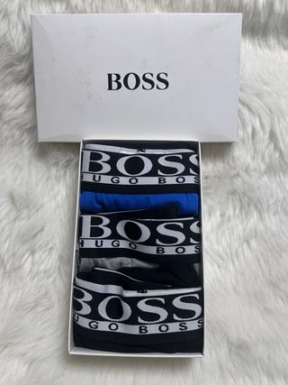 Pack de calzoncillos de la marca Hugo Boss. Incluye varias unidades con el logo de la marca en la cinturilla. - Cinturilla elástica con logo. - Diseño con el nombre de la marca. - Talla M-L, en color azul, gris y negro.
