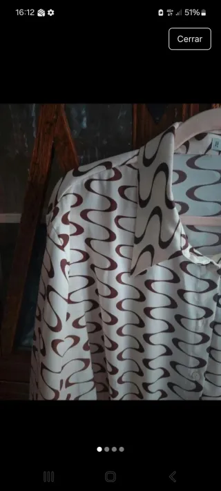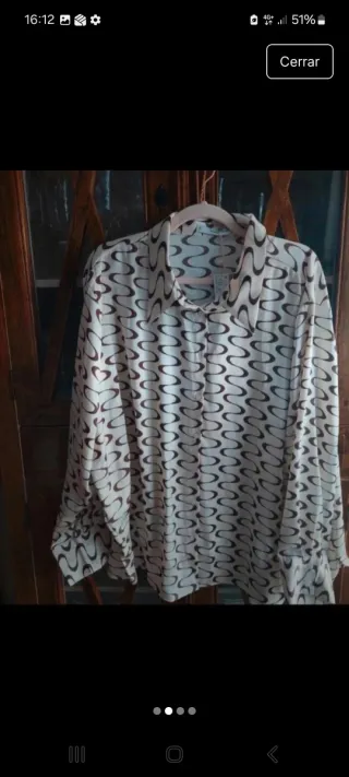 Blusa de la marca Mango con un estampado llamativo. - Diseño con ondas en marrón y blanco. - Talla 4XL (50-52). - Conserva las etiquetas originales.