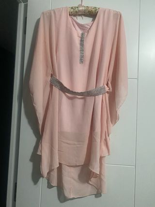 conjunto de Elegante blusa rosa con detalles brillantes. y falda corta por delate y larga por detrás así queda el conjunto de las dos piezas el que se que las dos 15 euros piezas sueltas 10 - Diseño con cinturón incorporado adornado con pedrería. - Tejido ligero y vaporoso. - Corte asimétrico en el bajo.