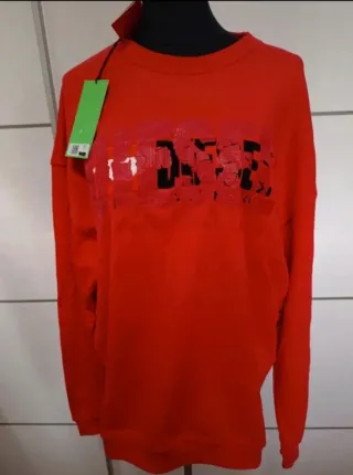 Sudadera de la marca Diesel en color rojo. Presenta un diseño gráfico en la parte frontal. Talla L, talla grande, nueva con etiquetas. sin estrenar. - Diseño gráfico llamativo. - Cuello redondo. - Manga larga.