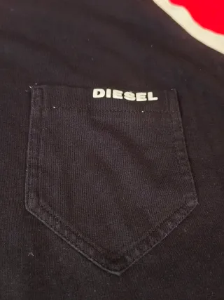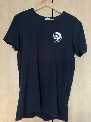 Camiseta negra de la marca Diesel con un diseño llamativo. - Logo grande de Diesel en blanco en la parte delantera. - Cuello redondo. - Manga corta.