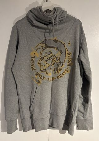 Sudadera original Diesel en color gris jaspeado, con diseño frontal estilo vintage y efecto desgastado. Estampado circular con cabeza indígena y el lema “Only the Brave”, icónico de la marca. - Detalles: Marca: Diesel Color: gris jaspeado Estampado frontal en tonos beige/dorado con efecto envejecido Cuello alto tipo braga ajustable con cordones (no es capucha) Bolsillo delantero Puños y bajo acanalados Tejido cómodo y cálido Talla: M Perfecta para un look casual, urbano o streetwear, original y fácil de combinar.