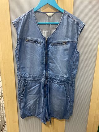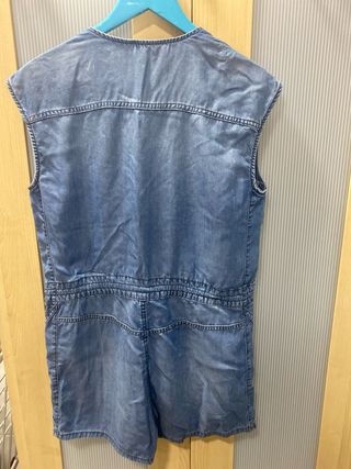 Mono corto de tejido tejano con cremallera frontal y cinturón ajustable. - Diseño sin mangas. - Dos bolsillos con cremallera en el pecho. - Bolsillos laterales. - Cintura elástica con cordón.