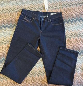 Pantalón vaquero de la marca Diesel original, nuevo sin estrenar, corte ajustado, talla US 30/32(42 española), mide 42-43 cm cintura y 107 cm longitud..... - Color azul oscuro. - Diseño clásico de cinco bolsillos. - Parche de cuero con logo en la parte trasera.