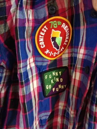 Camisa de cuadros con capucha de la marca Diesel. Presenta un diseño llamativo con varios parches. - Diseño a cuadros en tonos azules y rosas. - Capucha integrada. - Parches decorativos. - Cierre de botones.