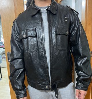 Cazadora estilo biker de cuero. - Cierre frontal con cremallera. - Múltiples bolsillos con cremallera. - Detalle de cremalleras en los puños. - Cuello con solapas y botones a presión.