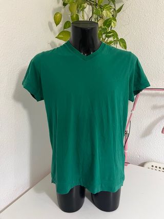 Camiseta de manga corta con cuello en V. - Color verde vibrante. - Diseño clásico y versátil.
