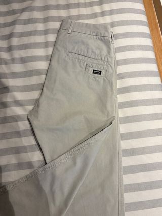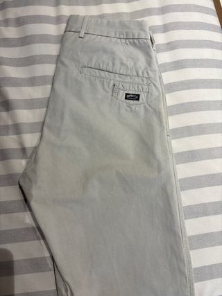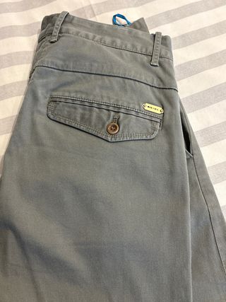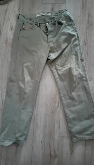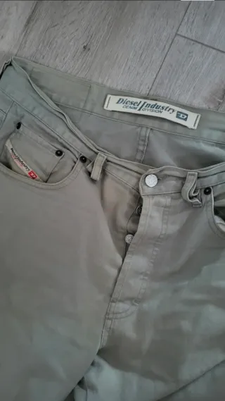 Pantalón de la marca Diesel en color gris. Estilo Chinos Presenta un diseño moderno y versátil. Talla M o 31 - Bolsillo trasero con botón. - Detalle de placa metálica con el logo de la marca.