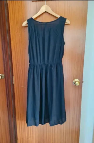 Pack compuesto por: - Vestido Seraphine negro con bordado y cremallera en escote, talla S - Blusa C&A topos, talla M - Bañador Mamalicious negra, talla M - Pantalón Esmara azul claro, talla 38