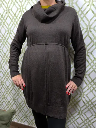 Vestido cómodo y elegante para embarazadas. Su diseño favorece la figura y se adapta a los cambios del cuerpo. - Tejido suave y agradable al tacto. - Cuello tipo bufanda. - Cintura ajustable con cordón. - Detalle de botones en la parte inferior.