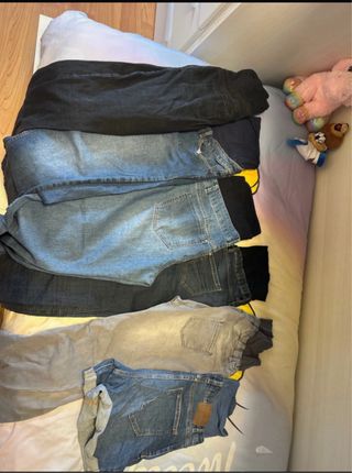 Lote de ropa para embarazo en tallas S y M. Incluye camiseta, pantalones vaqueros y leggings. - Pantalones vaqueros claros con banda de soporte. Talla 38 - Pantalones vaqueros oscuros de HyM con banda de soporte. Talla 36 - Leggings negros pirata. Talla M - Pantalones cortos. Talla M - Camiseta de HyM. Talla S Lote 70€. Preguntar precios por separado.
