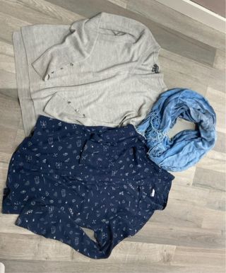 jersey gris boyon plata en puños,camisa estampada lefties y pañuelo perfecto estado sin uso por embarazo talla 38/40