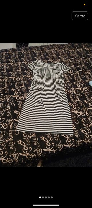 Precioso vestido de rayas blancas y negras, ideal para embarazadas. Es de manga corta y tiene un corte favorecedor. - Se encuentra en muy buen estado. - Perfecto para cualquier ocasión.