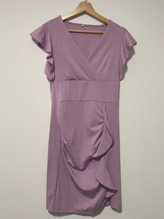 Vestido corto lila embarazada. Es una talla L, muy elástico, se adapta muy bien a la barriga y queda muy bonito con el volante de al lado. Se ha usado una vez.