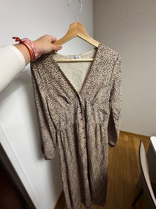 Vestido midi con un llamativo estampado animal print. talla M/L. Estoy embarazada y lo compré pensando que me quedaría, pero no me ajusta en la cintura. costó 69€ - Diseño de manga larga. - Cuello en V. - Cierre de botones en la parte delantera. - Cintura elástica para un ajuste cómodo.