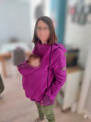Abrigo versátil para porteo, embarazo y uso estándar. Su diseño permite adaptarlo a diferentes etapas. - Tejido de forro polar suave. - Cremallera frontal asimétrica. - Capucha con forro interior de lunares. - Puños con abertura para pulgar.