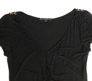 Preciosa camisa negra de la marca Gucci, talla M. Es una prenda elegante y cómoda, ideal para cualquier ocasión. - Diseño de cuello en V. - Detalle de pliegues en el centro. - Mangas cortas. - Cierre con botones dorados en los hombros.