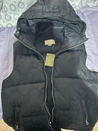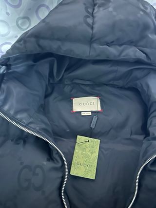 Chaqueta acolchada con capucha de la marca Gucci. Presenta un diseño con el logo GG grabado en toda la superficie. - Cierre de cremallera. - Bolsillos laterales con cremallera. - Capucha integrada.