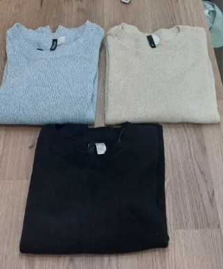 Conjunto de tres jerséis de punto de la marca H&M. - Jersey de color azul claro. Talla L. Poco uso. - Jersey de color beige. Talla L. Poco Uso. - Jersey de color negro: es talla M aunque es del mismo tamaño que los otros dos que pone talla L. Más usado que los otros dos pero en buen estado. Envío rápido 🚚 Si necesitas medidas específicas pregunta sin compromiso.