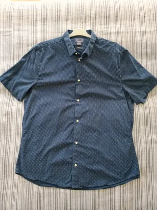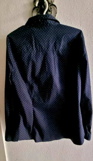 Camisa de manga corta de H&M con un diseño de pequeños lunares blancos sobre fondo azul marino. - Confeccionada en algodón premium. - Cuello clásico. - Cierre de botones.