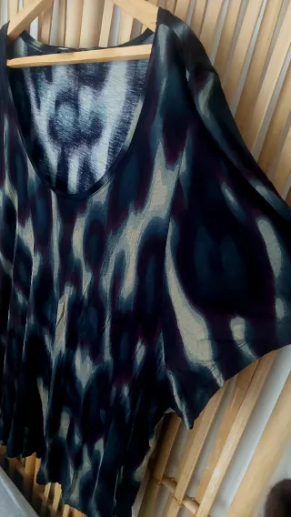 Top con estampado animal print de H&M. - Diseño con cuello redondo. - Manga corta. - Tejido ligero y fluido. - Tiene un ligero descosido al lado de la etiqueta trasera como se ve en la foto.