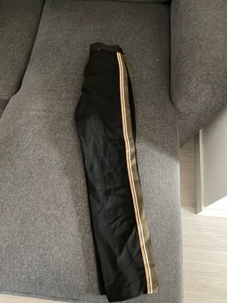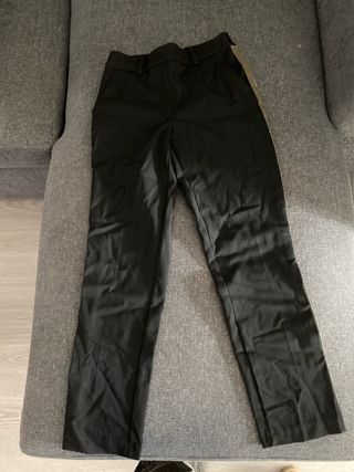 Pantalón de vestir H&M en color negro con un detalle de raya lateral en tono verde oliva y beige. - Raya lateral decorativa. - Cintura elástica.