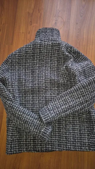 Chaqueta de punto con un diseño tejido a cuadros. Comprada primavera pasada y no se ha usado se puede decir. Está como de estreno. Su precio era de 69.90. Tejido tipo "tweed" exterior y tipo "raso" interior. - Cuello alto. - Cierre de cremallera. - Puños con botón. - Dos bolsillos exteriores y uno interior.
