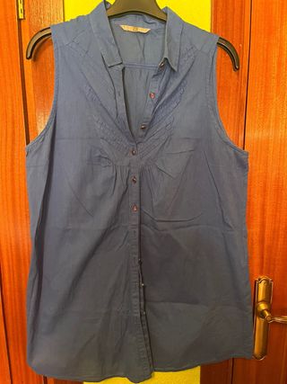 Blusa de vestir sin mangas en color azul marino. - Cuello camisero. - Cierre de botones en la parte delantera. - Detalle de pliegues en la zona del pecho.