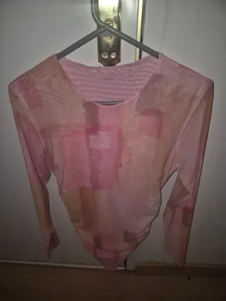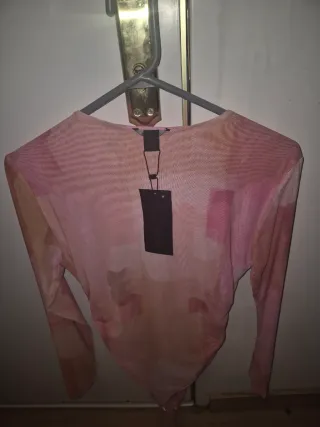 Body de tul con un bonito estampado en tonos rosas y naranjas. Es una prenda ligera y con un diseño original. - Tejido de tul semitransparente. - Mangas largas. - Escote en V.