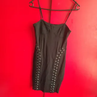 Vestido ajustado con tirantes finos y detalles de cordones en los laterales. - Diseño con escote pronunciado. - Cordones decorativos en los costados.