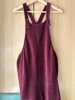 Lote de cuatro prendas de ropa premamá en talla S. El conjunto incluye un mono de pana en color burdeos. - Mono de pana con tirantes. - vestido de rayas - pantalón baquero negro - camiseta larga negra de punto