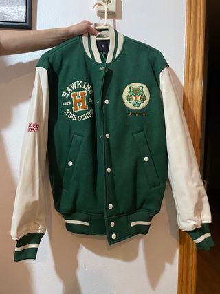 Chaqueta estilo universitario con temática de Hawkins High School. - Diseño inspirado en Stranger Things. - Mangas de cuero sintético. - Parche de tigre en el pecho. - Logo Hawkins High School bordado. Totalmente nueva, a estrenar. A pesar de haberla incluido dentro de la ropa de hombre, considero que podría ser unisex. ¡Ideal para un fanático de la serie!