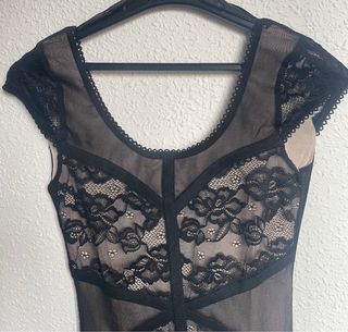 Vestido de H&M con un diseño elegante y sofisticado. - Tejido principal de encaje negro. - Forro interior en tono beige. - Mangas cortas de encaje. - Escote redondeado con borde festoneado.