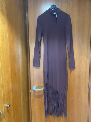 Vestido de manga larga con cuello alto y detalle de flecos en el bajo. - Diseño con cuello alto. - Mangas largas. - Bajo con flecos.