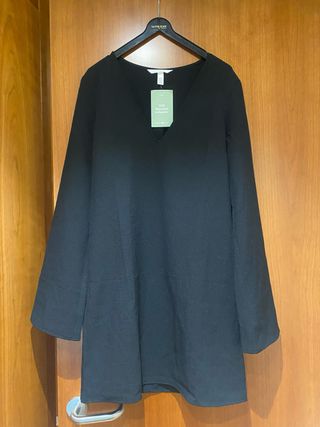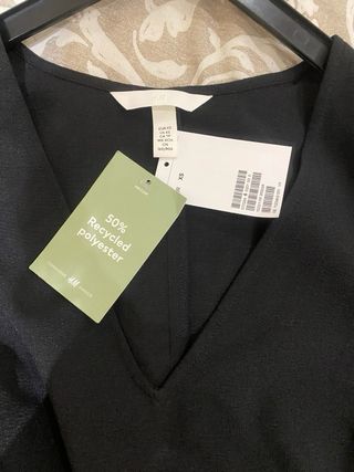 Vestido negro de H&M con un diseño moderno y elegante. - Escote en V. - Mangas largas. - Tejido con textura. - Confeccionado con 50% poliéster reciclado.