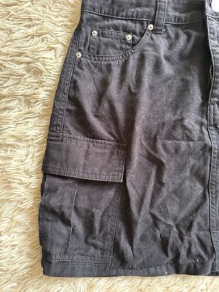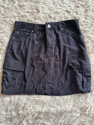 Falda de estilo cargo en color negro. Diseño moderno y versátil. - Bolsillos laterales de gran capacidad. - Cierre de cremallera y botón. - Cintura con trabillas para cinturón.