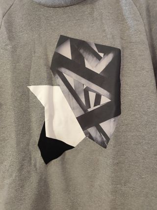Sudadera con capucha y cuello tipo chimenea de H&M en color gris vigoré (marengo). Tiene un diseño frontal geométrico y moderno en colores blanco y negro. Lo más destacado es su cuello alto ajustable con cordones, que le da un toque diferente y más abrigado que una sudadera convencional. El corte de las mangas es tipo ranglán, lo que permite una mayor libertad de movimiento y un ajuste más cómodo en los hombros. Marca: H&M Estado: Muy bueno, bien cuidada. Talla: S (ver foto de la etiqueta para medidas internacionales). Tejido: Tacto suave, ideal para otoño/invierno. Detalles: Puños y cintura elásticos en punto de canalé.