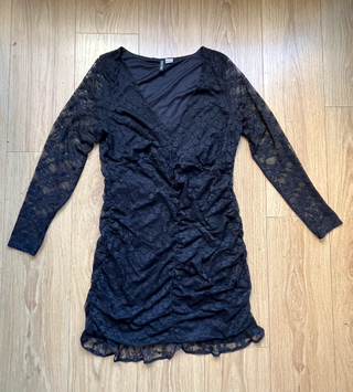 Vestido corto en color negro con encaje floral, escote en pico cruzado y fruncido en la parte frontal. Con mangas largas transparentes de encaje, forro interior opaco en el cuerpo. ✨ Color: Negro ✨ Marca: H&M ✨ Talla: L ✨ Medidas: 40cm de hombros, 47cm de axilas y 90cm de largo ✨ Composicion: 90% poliester 10% elastano