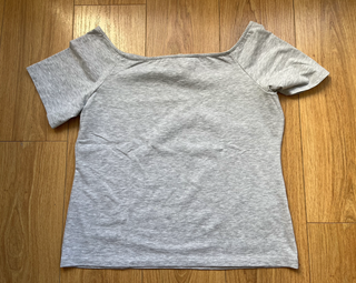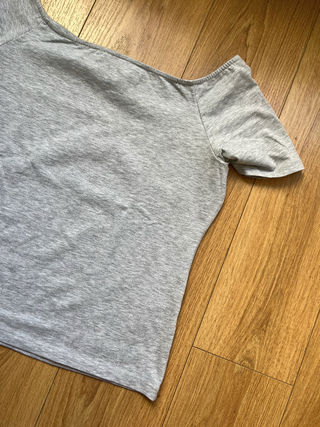 Camiseta de manga corta en color gris con escote bardot que resalta los hombros. De un tejido suave y elástico. ✨ Color: Gris ✨ Marca: H&M ✨ Talla: XL ✨ Medidas: 41cm hombros / 53cm axilas / 41cm largo ✨ Composicion: 52% algodón, 42% poliester, 5% elastano